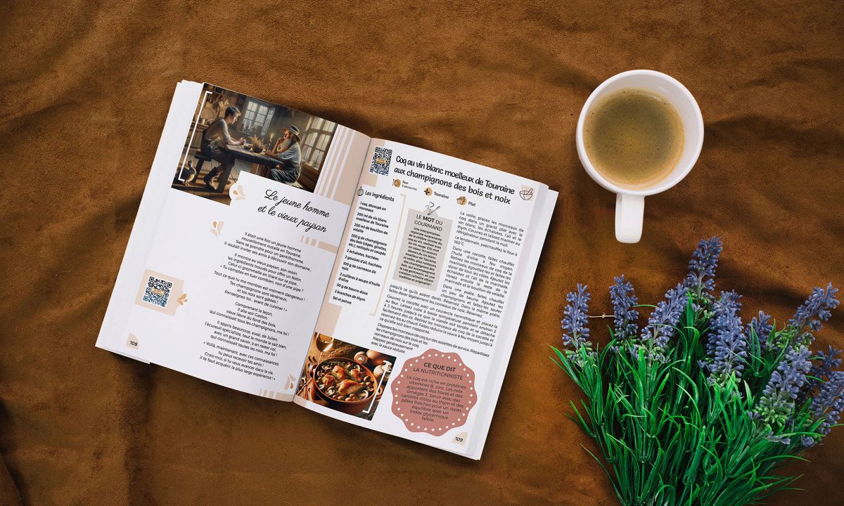 Mon travail a consisté à créer une mise en page vivante et fluide, afin de guider le lecteur entre les textes, les recettes et les QR codes menant aux vidéos illustrées. L’objectif est de proposer une expérience de lecture immersive, à la fois visuelle, gustative et narrative.
