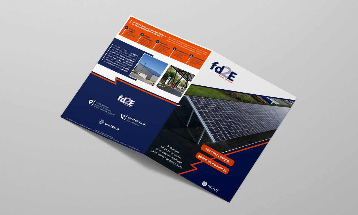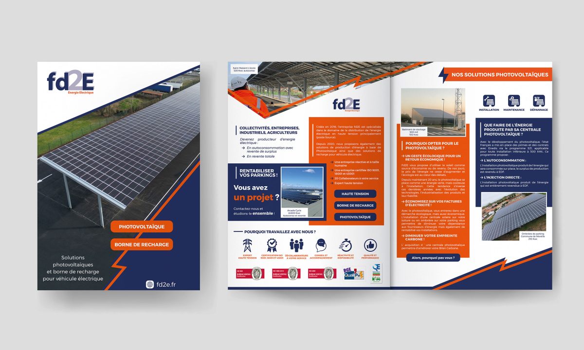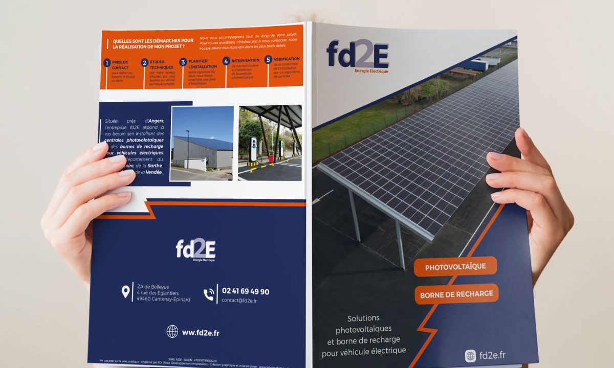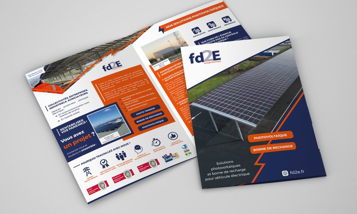 Fd2E a fait appel à La Boîte à Bidules pour la création d’une plaquette commerciale destinée à présenter son activité. L’entreprise, située à Cantenay-Épinard (Maine-et-Loire), est spécialisée dans les solutions photovoltaïques, la haute tension et les bornes de recharge pour véhicules électriques.