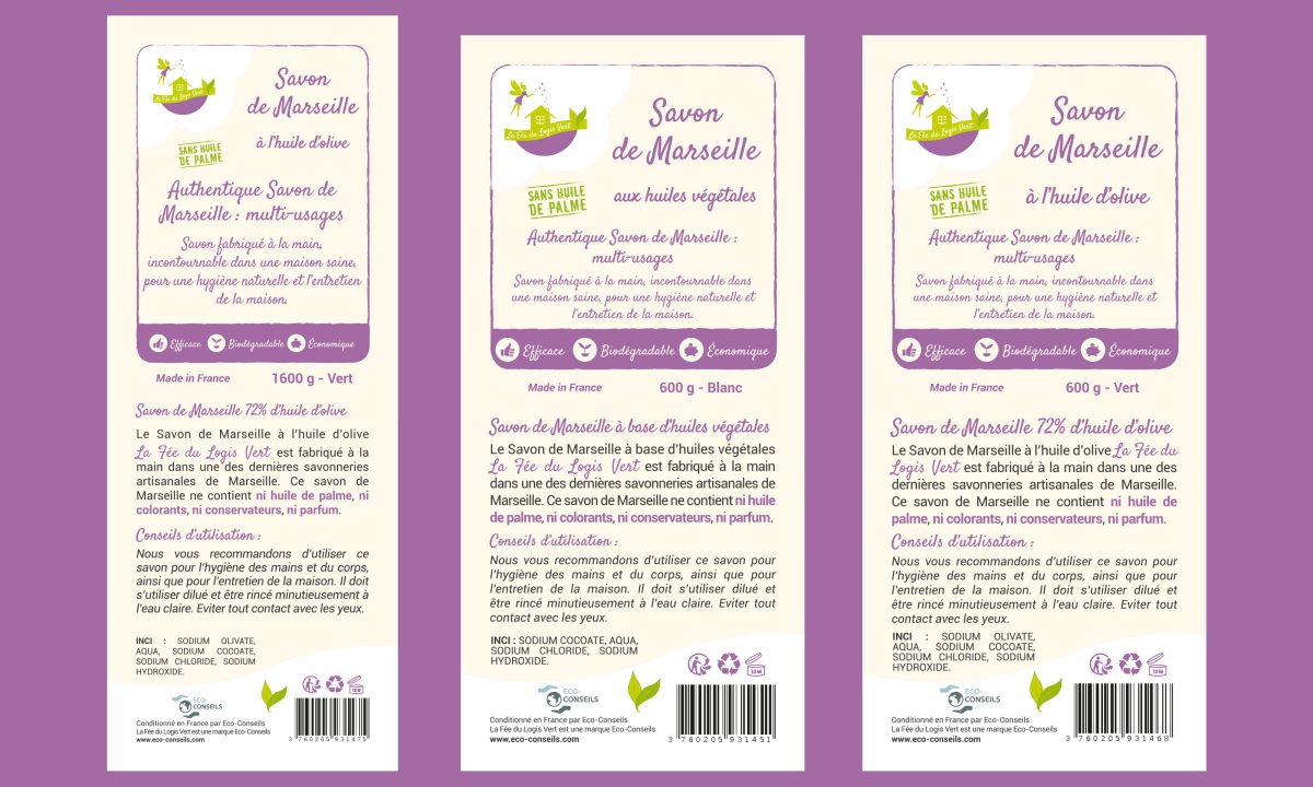 Eco-Conseils, fabricant et distributeur de produits naturels et biologiques pour la maison, le bien-être, la puériculture, le jardinage, a choisi la Boîte à Bidules pour la création d’étiquettes de ces 5 étiquettes pour du savon de Marseille.