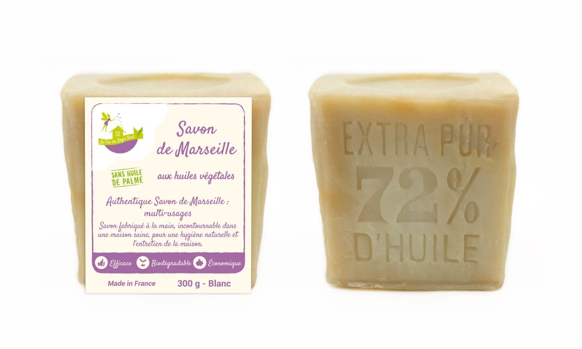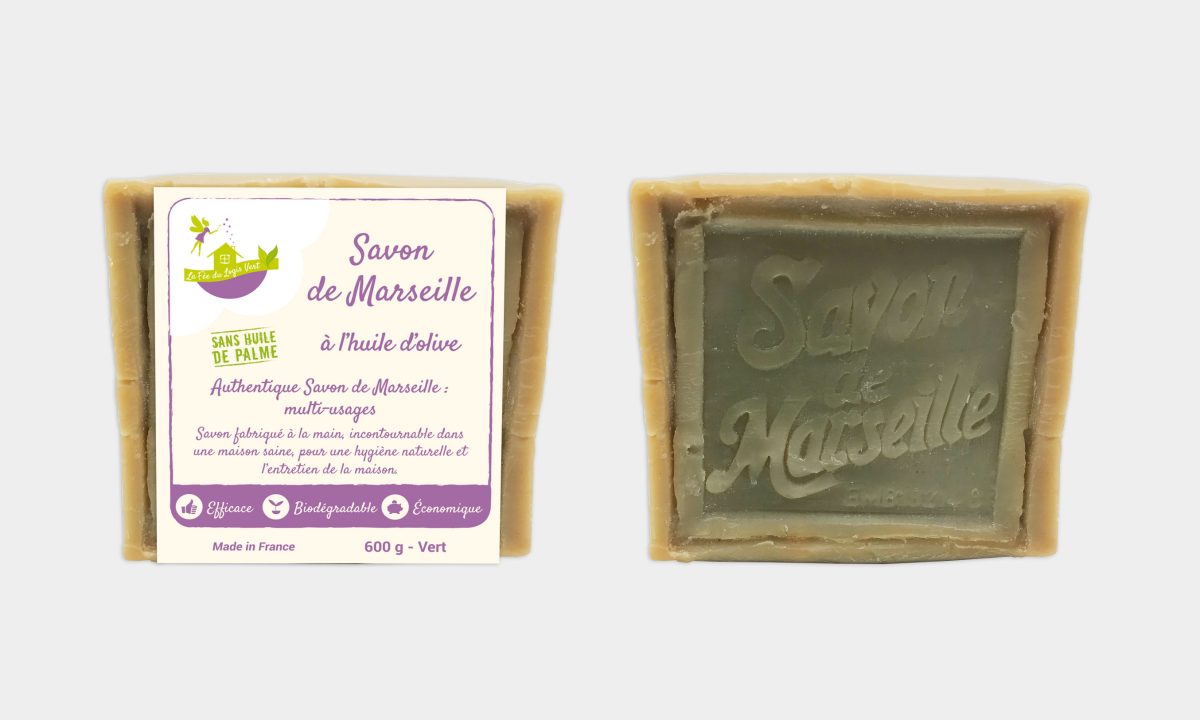 Le savon de Marseille La Fée du Logis Vert est fabriqué à la main à base d’huiles végétales. Il ne contient ni huile de palme, ni colorants, ni conservateurs, ni parfums artificiels. Eco-Conseils propose deux savons (aux huiles végétales et à l’huile d’olive) et en trois tailles 2 300g, 600g et 1,6 kg.