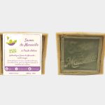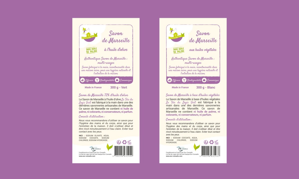 Nous avons travaillé ensemble sur la création de 5 étiquettes pour du savon de Marseille sous la marque La Fée du Logis Vert. Nous avons commencé par travailler sur une seule étiquette que nous avons ensuite décliné pour les différents produits. Il y a trois tailles différentes pour correspondre aux différents poids du savon.