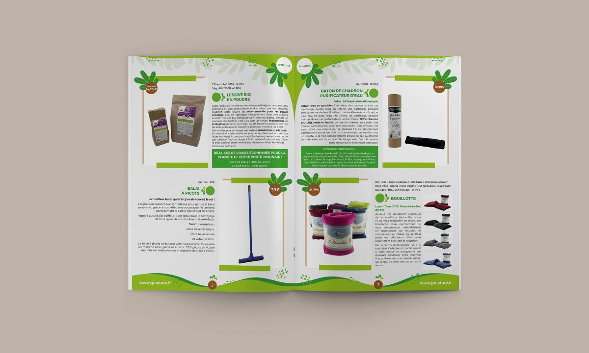 Depuis cette année, la Boîte à Bidules réalise les catalogues produits pour JP Nature afin de présenter leurs différents produits bien-être, confort et autour de la maison écologique.