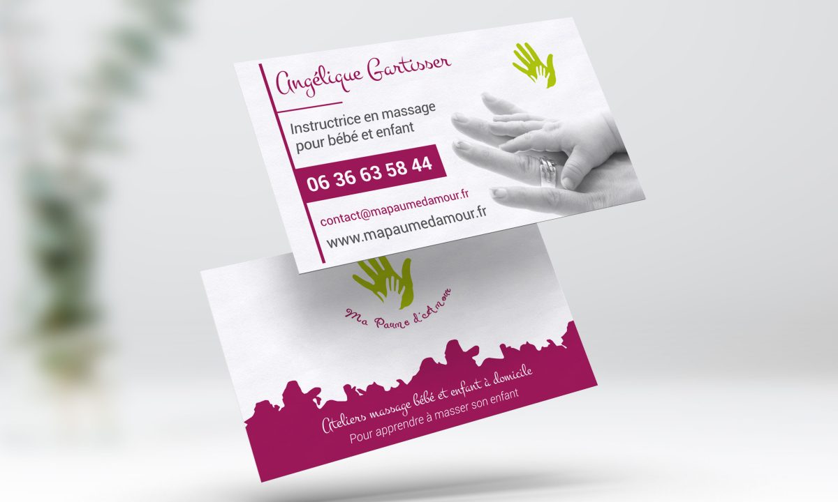 Ma Paume d’Amour propose des ateliers à domicile pour apprendre à masser son bébé ou son enfant entre Toul et Nancy, Meurthe-et-Moselle. Le but cette carte de visite reste le même qu’il y a 10 ans : se faire connaître et trouver de nouveaux clients. La carte de visite sera distribuée en main propre aux parents ou déposée chez des partenaires.