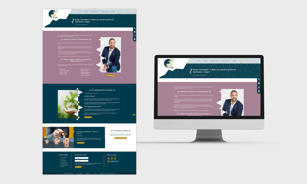 Dans le cadre de la création d’une entreprise et après avoir réalisé l’identité visuelle de Dyade Consultants comprenant le logo, la carte de visite, la plaquette commerciale et la pochette à rabats, le client avait besoin d’un site internet pour détailler et présenter ces différentes prestations : développer son patrimoine, optimiser sa fiscalité et ses placements, protéger ses proches, préparer sa retraite…